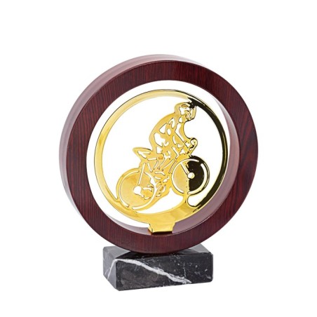 Sujet en métal doré découpe laser, cerclé d'un bois vernis avec socle en marbre noir