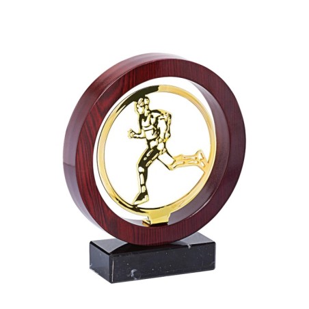 Sujet en métal doré découpe laser, cerclé d'un bois vernis avec socle en marbre noir