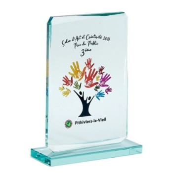 TROPHÉE - 3 hauteurs : 17 cm - 19 cm - 22 cm ✓ Matière du trophée : Verre épaisseur 12 mm ✓ Finition : Cristal jade ✓ Possibilité d'ajouter un écrin : Voir étape 5 après sélection de l'activité ✓ Personnalisation : Télécharger votre logo après l'étape 1 ✓ Frais Technique de 15 €, une seule fois et valable pour tous les trophées commandés avec ce logo. ✓ Une épreuve numérique vous sera envoyée au préalable à titre de contrôle ✓ Impression couleur gratuite : Votre Logo et texte (40 caractères inclus puis 0.05 € le caractère suppl.) ✓ Expédition en 48h après acceptation de la maquette. Attention : Le verre est un matériau noble mais fragile, en cas de chute ou de choc avec un objet dur il peut se casser et produire des pointes et des zones coupantes. Ne convient pas pour récompenser des jeunes enfants.