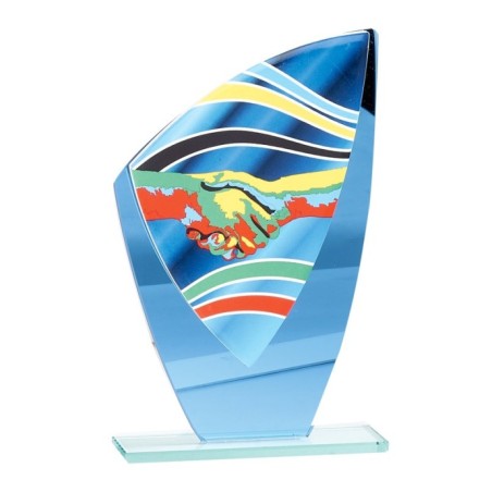 Céramique imprimée montée sur un support en verre-miroir bleu et une base en verre transparent