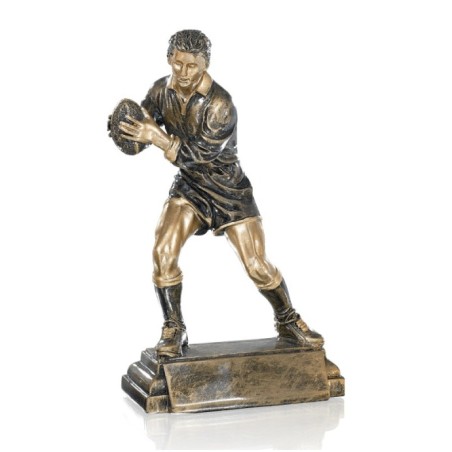 Rugbyman en action sur socle rectangulaire, Sculpture en résine façon bronze