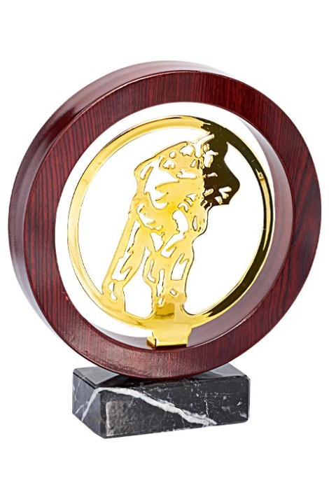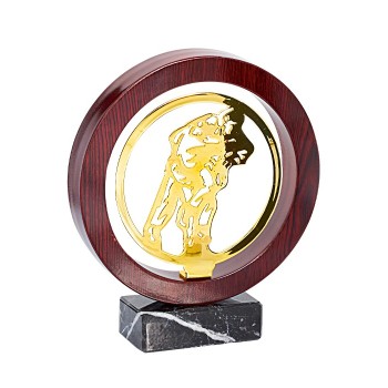 Nouveauté 2025, Sujet en métal doré découpe laser, cerclé d'un bois vernis avec socle en marbre noir